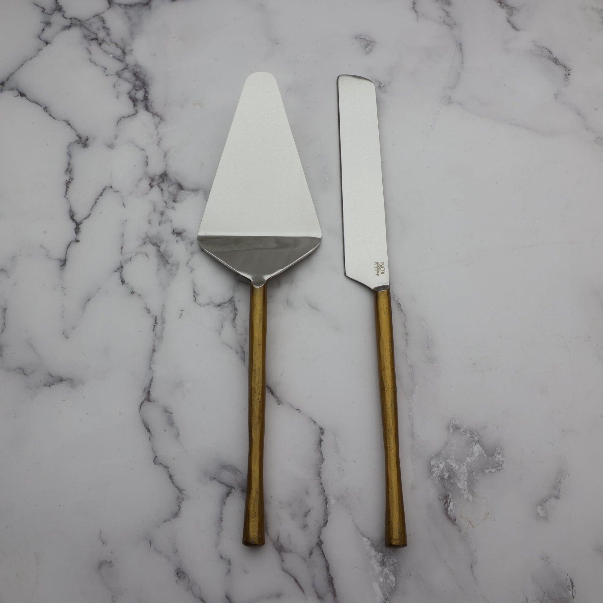 Our Camellia Cake Serving 2 Pc. Set features a highly polished stainless steel knife and serving ladle with vintage gold handles. The signature organic handles of the Camellia flatware design and the warm gold finish give this cake serving set a laidback rustic charm.