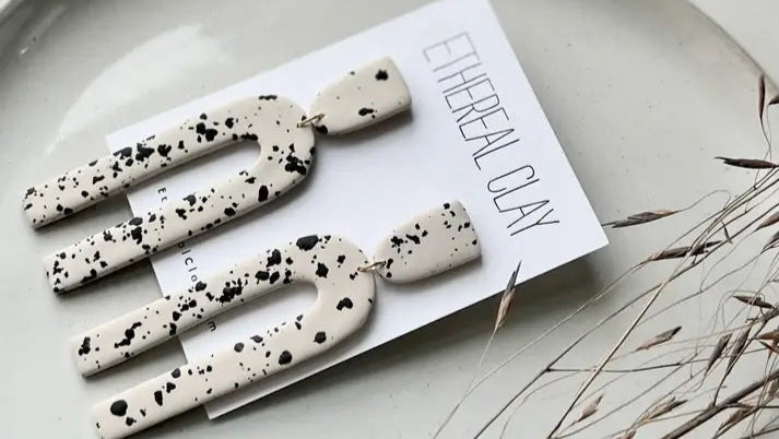 Immerse yourself in the bohemian vibe with Ethereal Clay's Dora Handmade Clay Earrings. Each pair, tinted with a soothing taupe neutral, is a unique work of art, with color placement varying for a one-of-a-kind aesthetic. Crafted in West Virginia, these dangle earrings echo the earthy tones of their birthplace. Made from hand-mixed colors, they showcase an array of textures and painted pieces. As gentle on your skin as they are on your eyes, they come with nickel-free metals, ensuring they're hypoallergenic and suitable for sensitive ears. Double-secured for transport, your earrings arrive on a logo brand earring card, tissue wrapped, and placed in Muslin Bags to prevent damage during shipping.