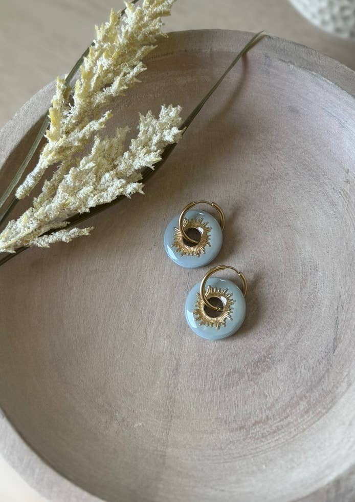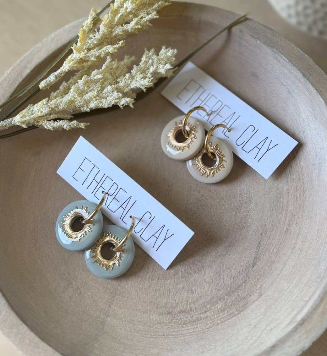 Adorn yourself with the Gold Charm Huggie Clay Hoops from Ethereal Clay. These unique dangle earrings embody an earthy, bohemian spirit, handcrafted with care in West Virginia. Each piece is made with hand mixed colors, showcasing distinct textures and painted details. Ideal for sensitive ears, the earrings feature nickel-free metals and come double-secured on a logo brand earring card. Your purchase arrives tissue-wrapped in a Muslin bag, ensuring safe delivery. Embrace your bold style with Ethereal Clay.