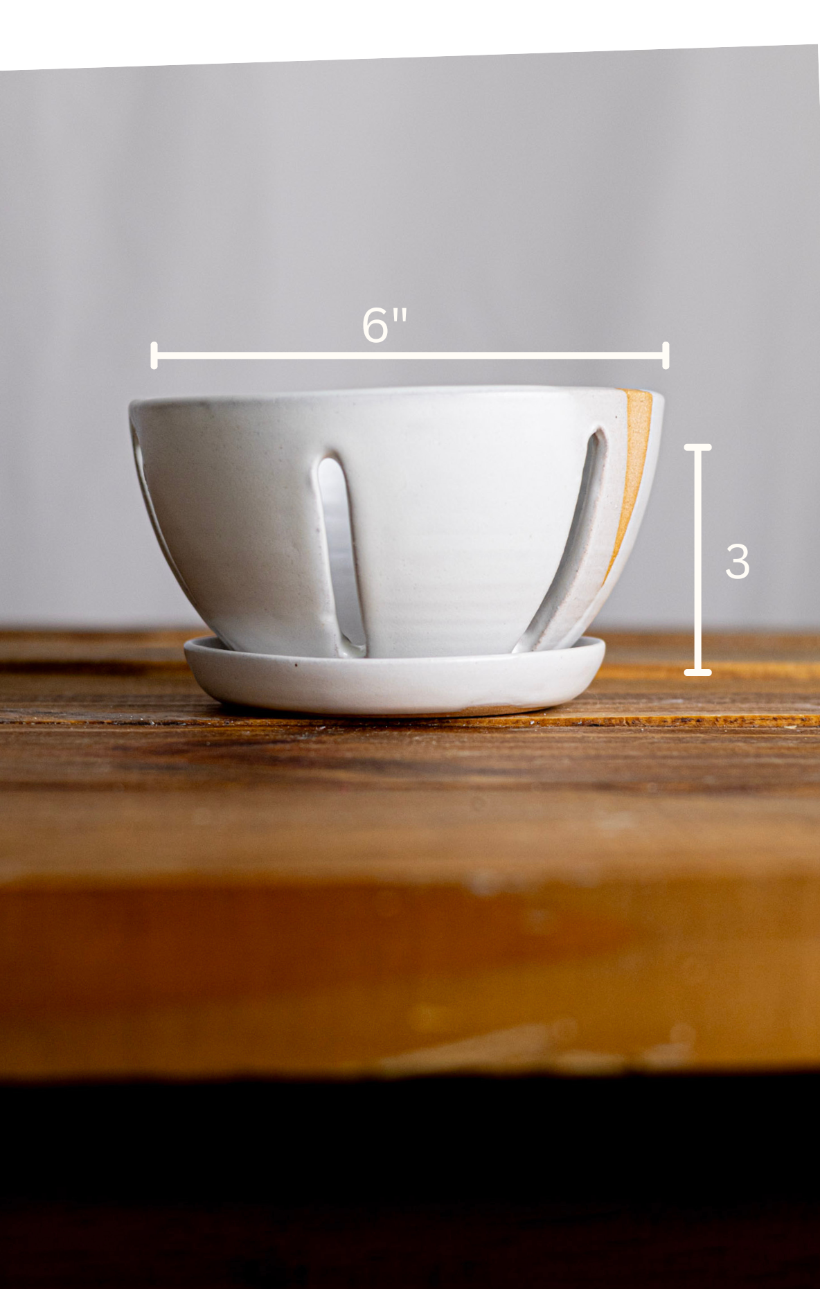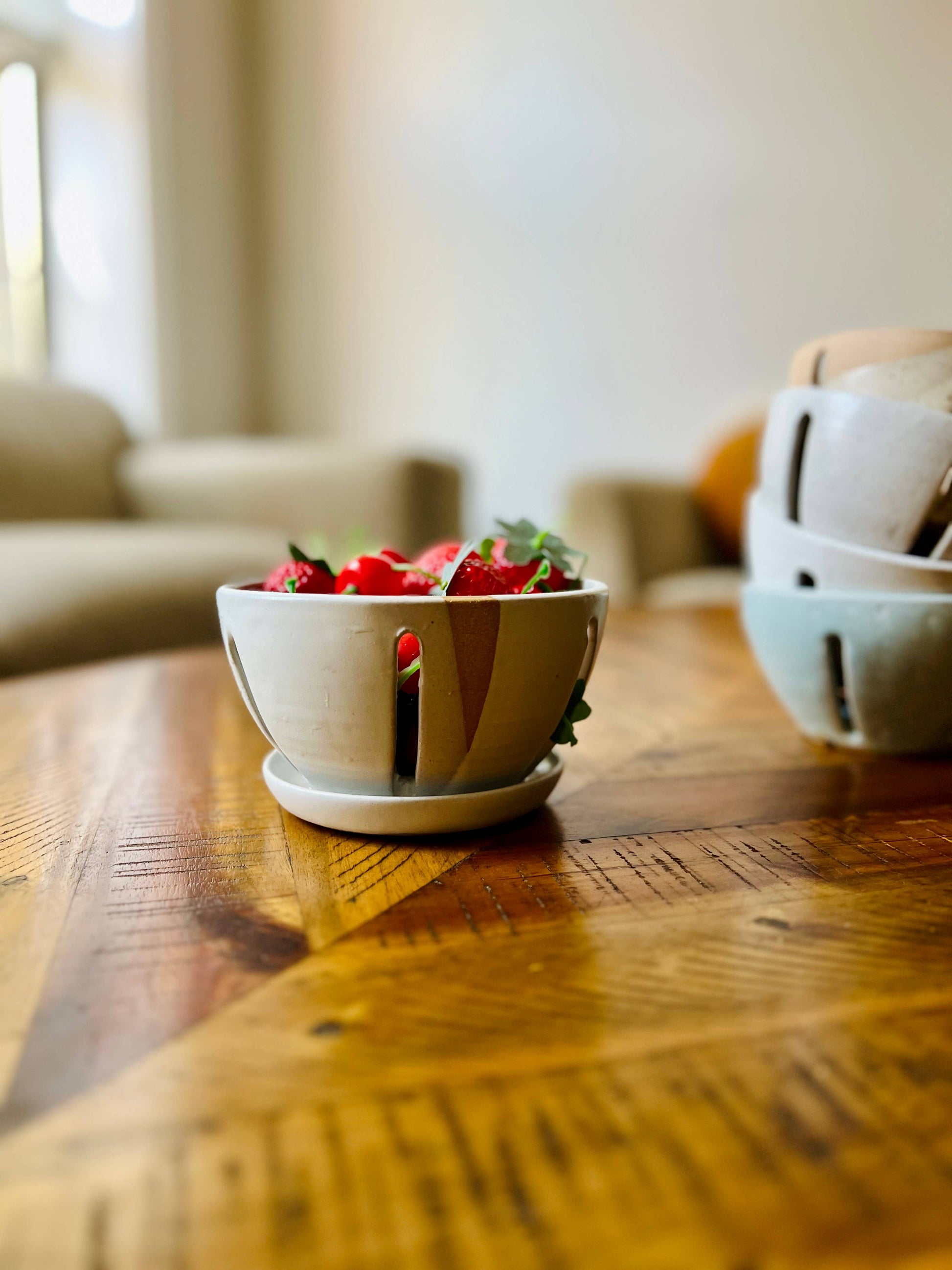 Crafted from natural stoneware clay, these charming bowls are as beautiful as they are functional. Designed for draining and serving fruits or veggies, they also double as stylish kitchen decor or thoughtful gifts. Each bowl is wheel-thrown with care, making every piece truly one of a kind. Saucer is included
