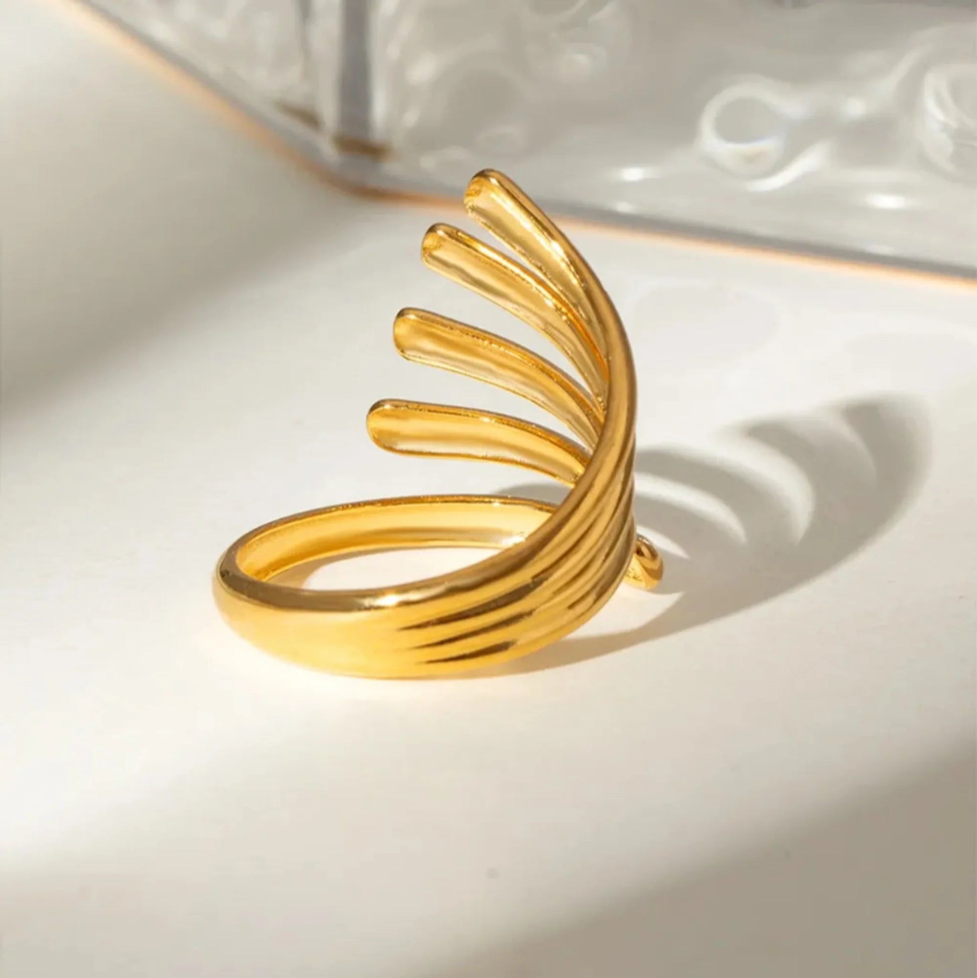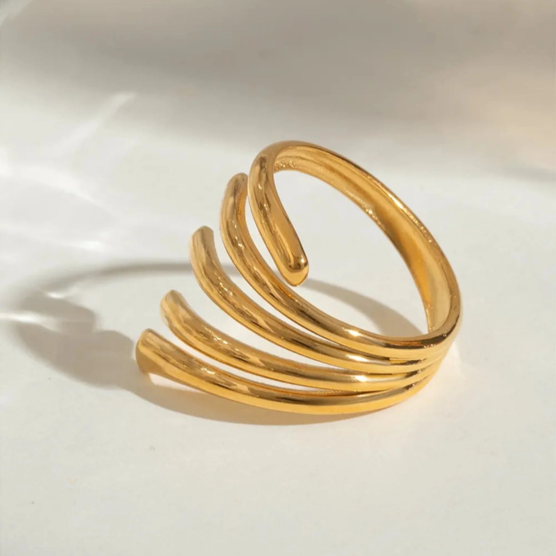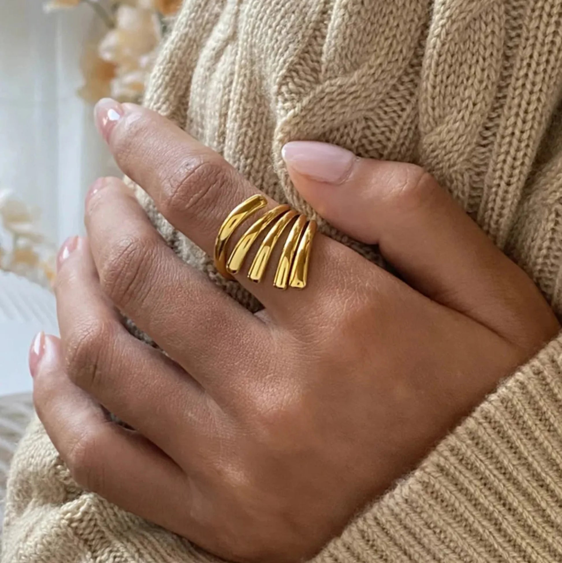 A symphony of golden strands, flowing in imperfect harmony. This open ring features layered, irregular lines that wrap the finger like a quiet echo of movement—fluid, bold, and unapologetically abstract.