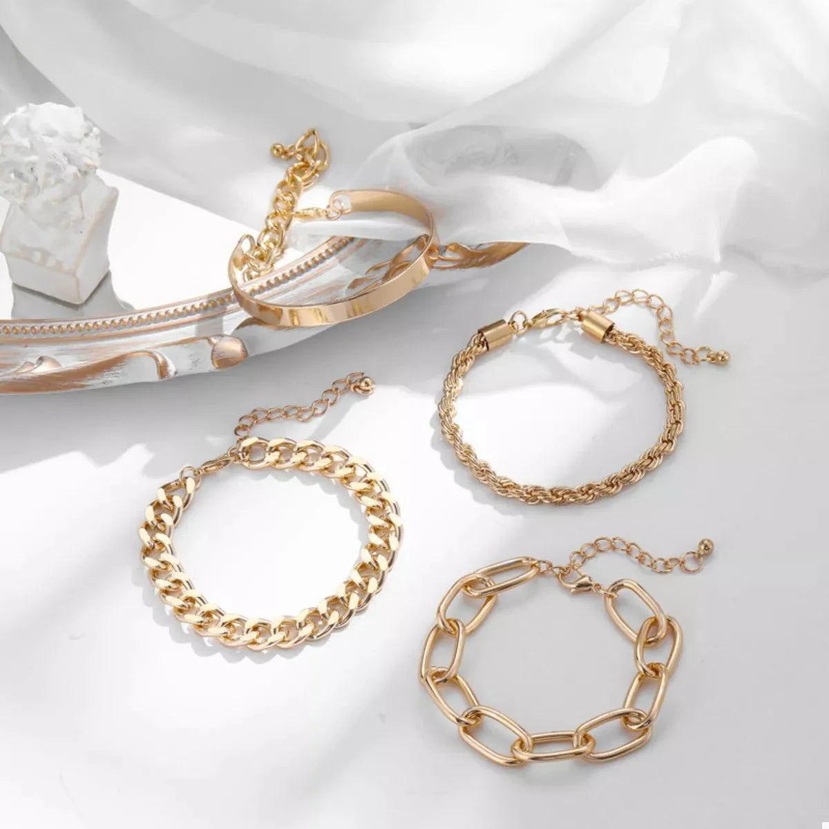 The Lumen Lineup illuminates your style with its quartet of 18K gold-plated treasures, each piece designed to catch and reflect light in perfect harmony. Crafted from premium alloy and bathed in lustrous gold plating, this four-piece collection transforms everyday moments into occasions that glow with sophisticated elegance.
