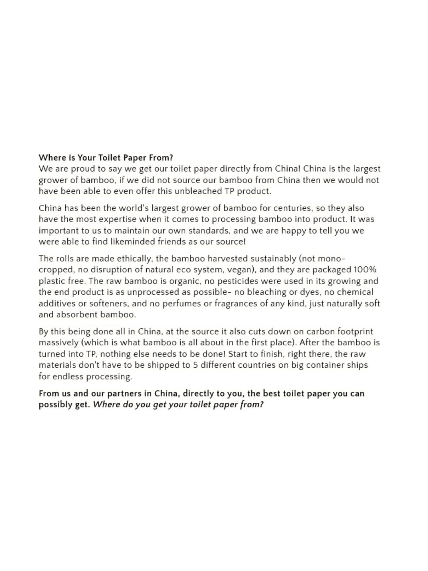 Extra soft and fluffy, 3-ply Bamboo Toilet Paper. Made from 100% renewable organic bamboo = no harsh chemicals.