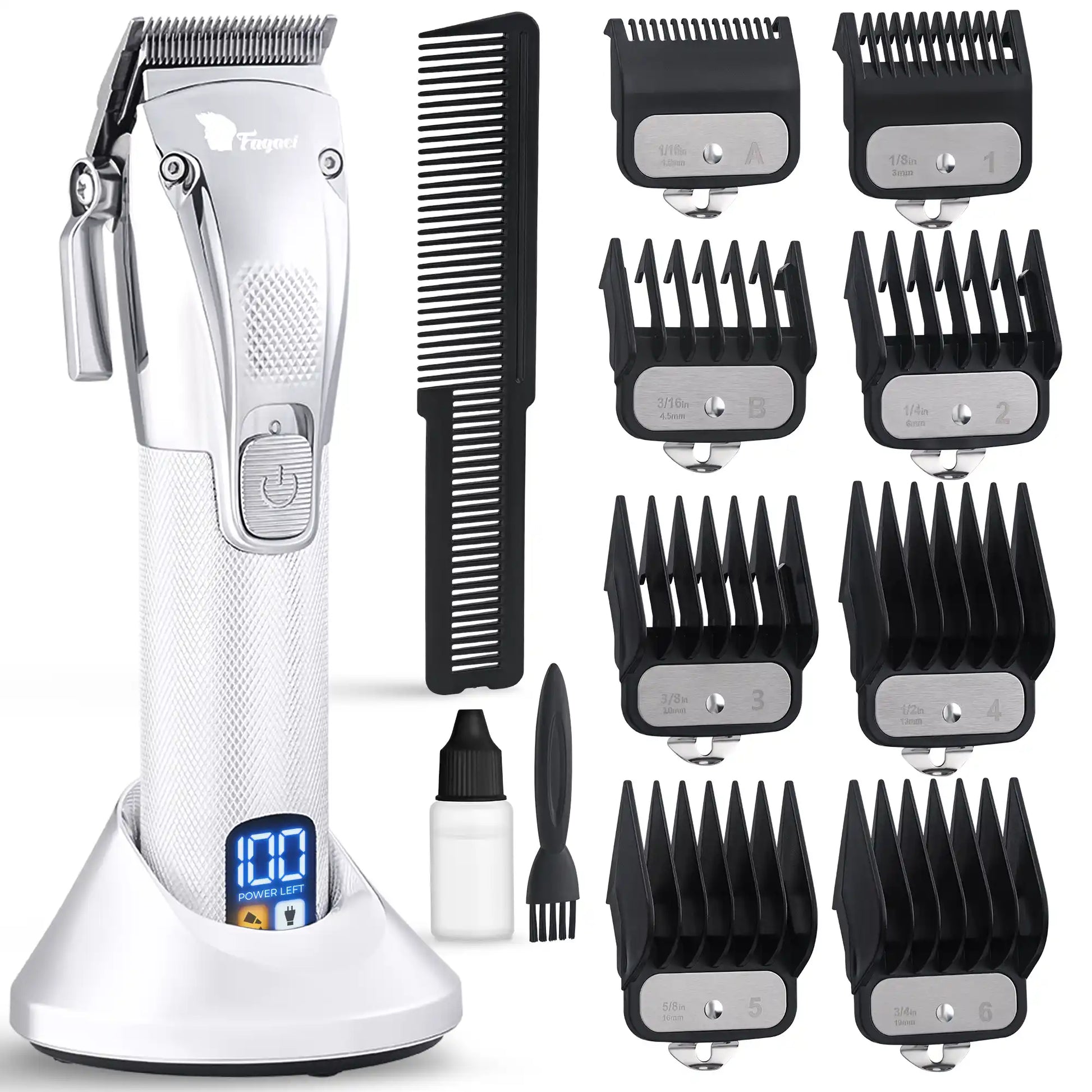 • πŸ”‹ ALL DAY BATTERY / 5 HOURS - Fagaci hair clipper makes your life easier. With 5 hours of battery life, you will never run out of battery during a haircut. The all-day battery life in just 3 hours of charging. Plus, the hair clipper has a charging stand for easier charging and a corded/cordless function.
