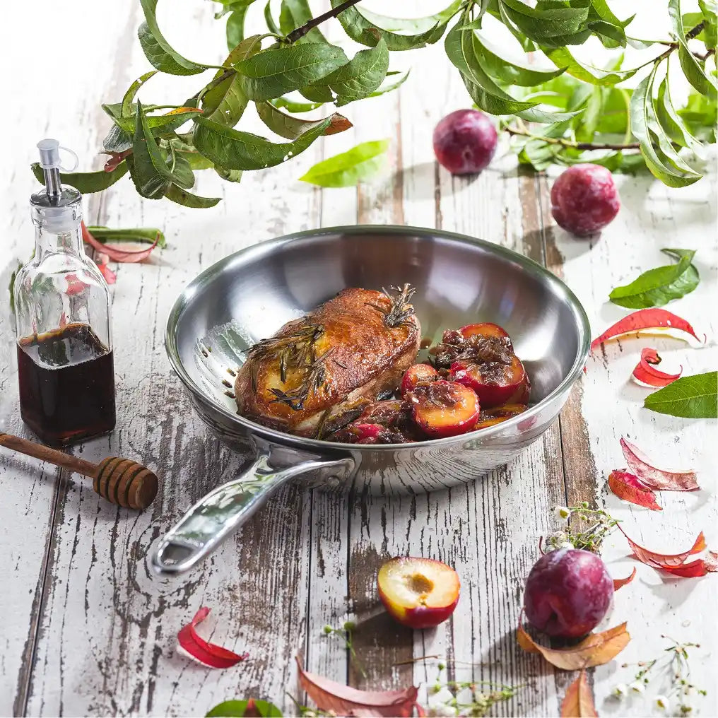 Castel'Pro® 5-ply stainless steel pan, glossy mirror finish with 5-layer thermo-diffuser base, fixed cast iron handle. Internal graduations. The 5 superimposed layers: stainless steel 18/10 + 3 layers of aluminum + stainless Castel'Pro® stoves allow a homogeneous distribution of heat throughout the body of the cooking utensil and not only at the bottom thermo-diffuser. The absence of a bottom report justifies a speed of rise and fall of the temperature and facilitates the cooking of the most technical devices. The unique round shape of the body of the utensil is ideal for mixing, sautéing and cooking. The 5-layer Castel'Pro® Stoves preserve the taste qualities of food and are easy to clean after cooking. The athermic solid stainless steel handle, perfectly linked to the body of the pan thanks to the stainless steel rivets, does not retain the heat on a ceramic hob.